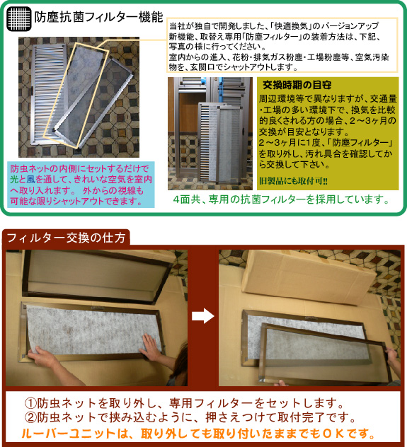 詳細を見る ↓ 【【【基本機能】】】 1.ルーバー脱着機能 ■脱着可能式ルーバー ■取外簡単で水洗いOK! 2. 通風調節機能 ■風調節可動ルーバー ■プライバシー保護 3. 防犯機能 ■内外カギ付き ■上下2点式のロック 4. 防虫ネット機能 ■取り外し可能式アミド ■張り替え簡単 5. 大型ポスト機能 ■郵便受、左右2ヶ所付 ■取手を兼ねた郵便受 6.V型開閉機能 ■本体、ラクラク開閉 ■本体、上部吊りコマ式 7. 高さ調整機能 ■5cmアジャスト材付 ■色々なドアに対応可 ※1〜7は標準装備 8.基本カラー ■3色から選べるカラー 【【【オプション機能】】】 9.バリアフリー機能 ■下枠が脱着可能式 ※アミドの使用時は 取り外しできません 10.フィルター機能 ■専用防塵フィルター |