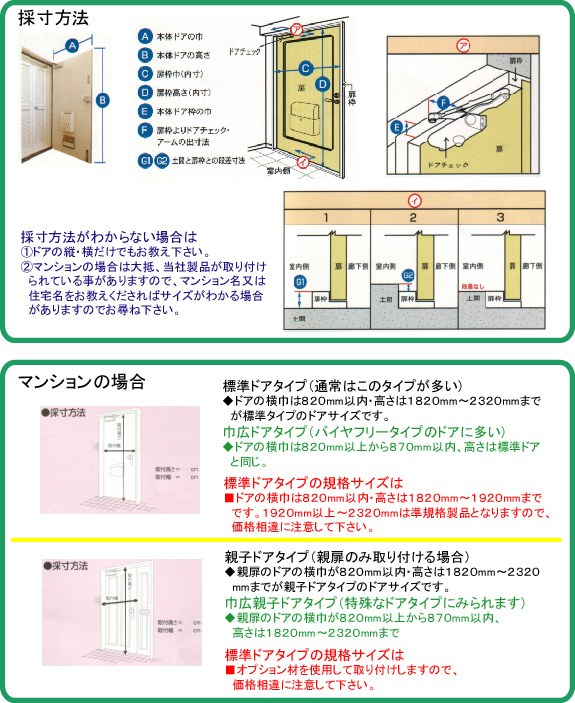 各寸法の詳細 ドア本体の寸法とドア枠 内側の内寸 A:本体ドア巾 mm B:本体ドア高さ mm C:扉枠巾(内寸) mm D:扉枠高さ(内寸) mm E:本体ドア枠の巾 mm 上部・ドアチェック部の寸法 F:扉よりドアチェック アームの出寸法 mm 下部・土間に段差がある場 合はタイプを1・2・3を参考 に測って下さい。 3の場合は記入しなくてよい。 G1: 土間が下がっている場合 mm G2: 土間が上がっている場合 mm お見積り希望の場合は 下記のどちらかに チェックして下さい。 商品と取付工事を希望する 商品のみ希望する メッセージ: 不明点や概算見積りなど 何でもご質問お寄せ下さい。 |