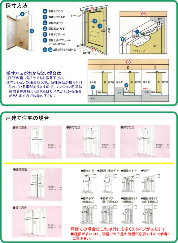 各寸法の詳細 ドア本体の寸法とドア枠 内側の内寸 A:本体ドア巾 mm B:本体ドア高さ mm C:扉枠巾(内寸) mm D:扉枠高さ(内寸) mm E:本体ドア枠の巾 mm 上部・ドアチェック部の寸法 F:扉よりドアチェック アームの出寸法 mm 下部・土間に段差がある場 合はタイプを1・2・3を参考 に測って下さい。 3の場合は記入しなくてよい。 G1: 土間が下がっている場合 mm G2: 土間が上がっている場合 mm お見積り希望の場合は 下記のどちらかに チェックして下さい。 商品と取付工事を希望する 商品のみ希望する メッセージ: 不明点や概算見積りなど 何でもご質問お寄せ下さい。 |