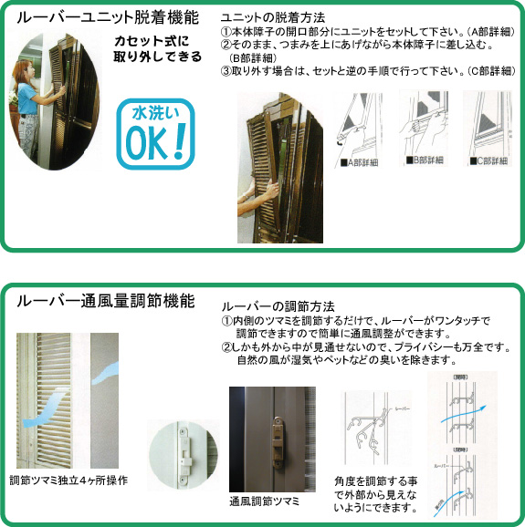別の詳細を見る ↓ 【【【基本機能】】】 1.ルーバーユニット機能 ■脱着可能式ルーバー ■通風調節式ルーバー 2.防犯機能 ■内外カギ付き ■上下2点のロック 3.防虫ネット機能 ■取り外し可能式アミド ■張り替え簡単 4.大型ポスト機能 ■取り入れ口が左右2ヶ所付き 新聞や郵便物も取り入れ可能 5.V型開閉機能 ■狭い玄関でもラクラク開閉 ■上部吊りコマ式で耐久性アップ 6.高さ調整機能 ■本体枠が5cm調整できるので あらゆるドアに適用できる ※1〜6は、 7.1/4収納機能 【【【オプション機能】】】 |
